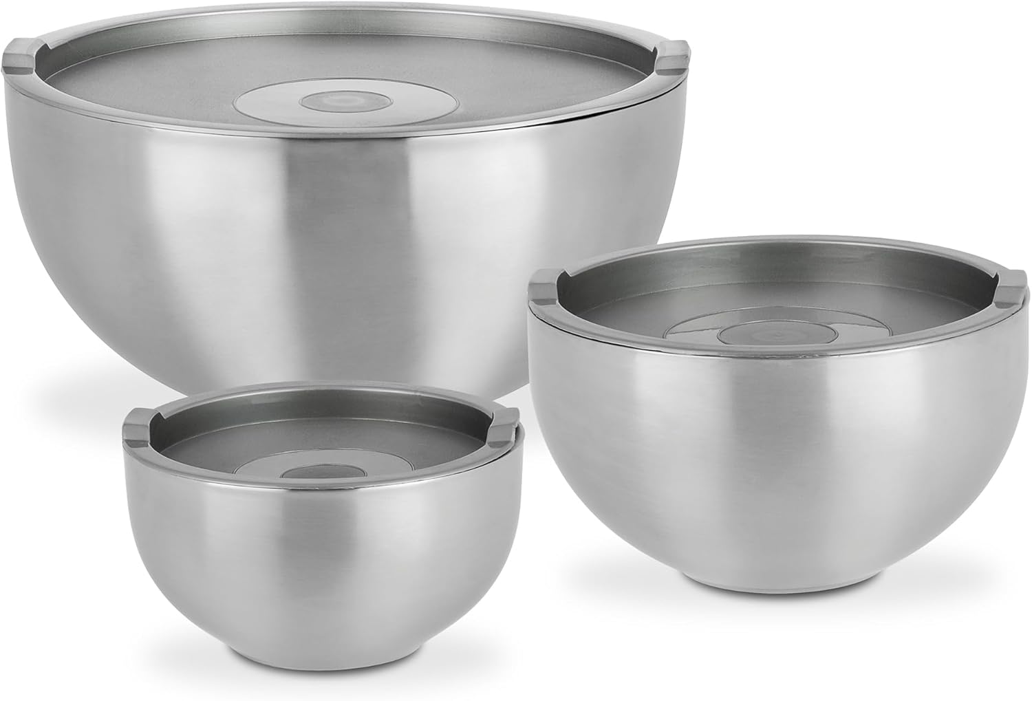 - PRACTICAL SET – This stainless steel serving bowl set consists of three different sized bowls (18, 22, and 26 cm) with matching plastic lids. Ideal for serving hot and cold dishes.