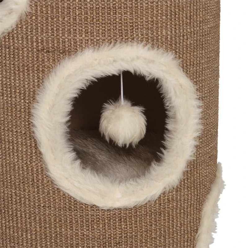 Die große Sisalkratzfläche und die verbundene Höhle bieten viel Platz zum Austoben. Die gepolsterte Liegeplatte mit Langhaar-Plüsch-Bezug sorgt für gemütliche Ruhephasen.